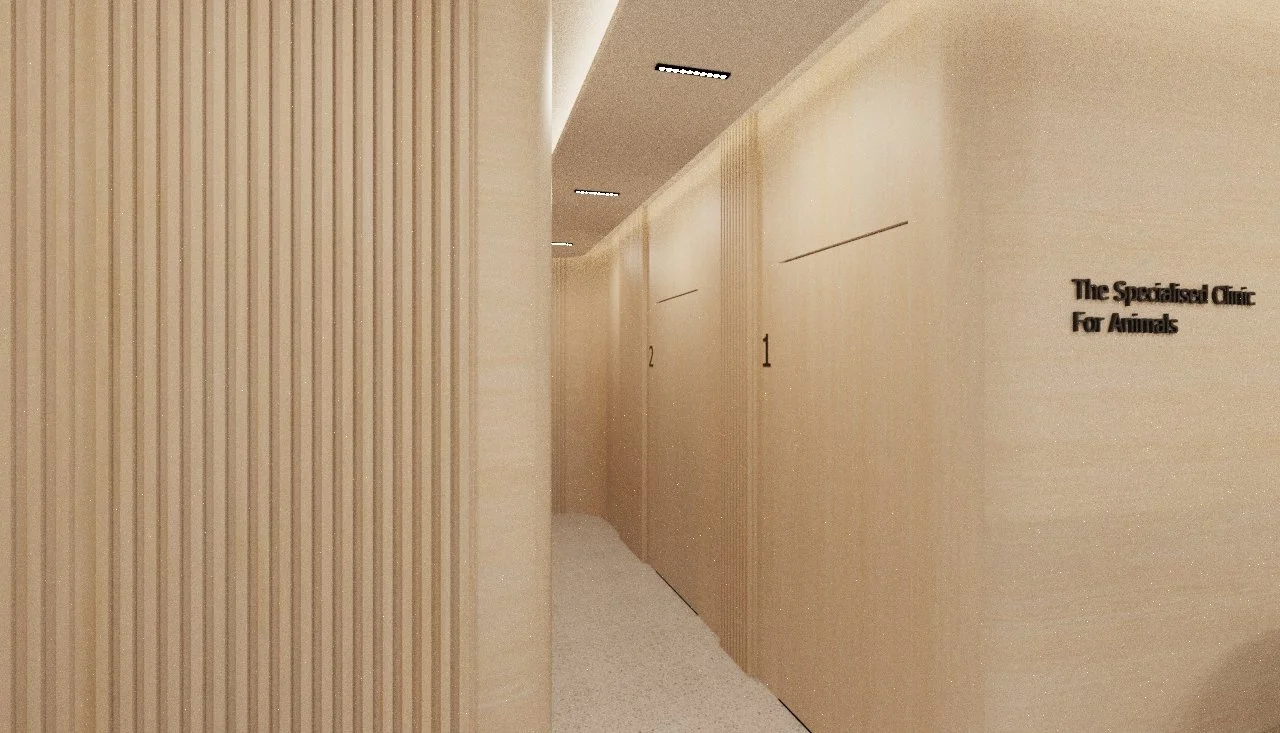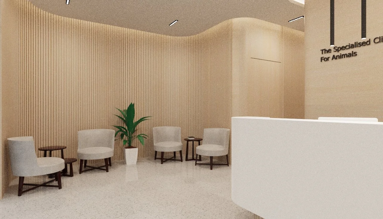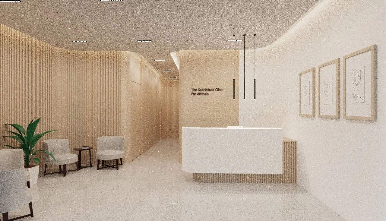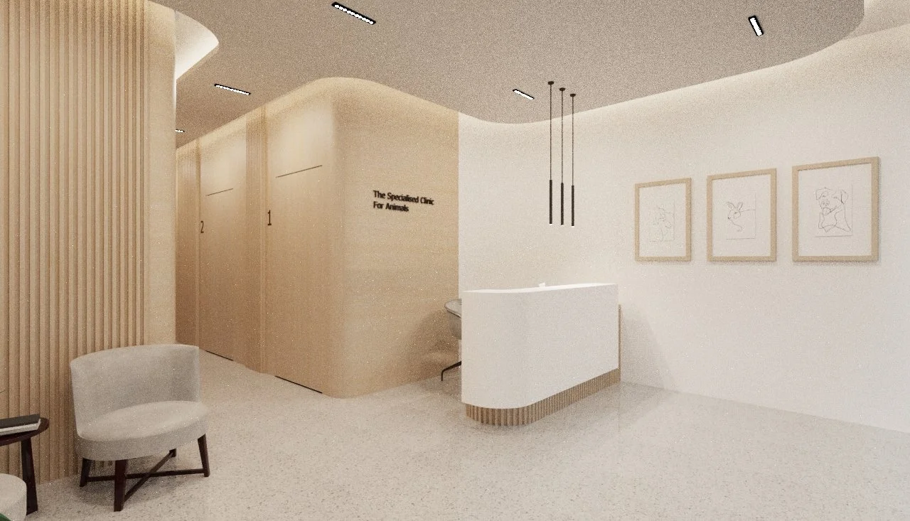 This animal clinic is designed to feel calm, welcoming, and well-organized. Soft wood tones, curved accents, and clean white surfaces come together to create a space that feels both friendly and professional. Thoughtful lighting and a comfortable lounge area enhance the experience for both pets and their owners.