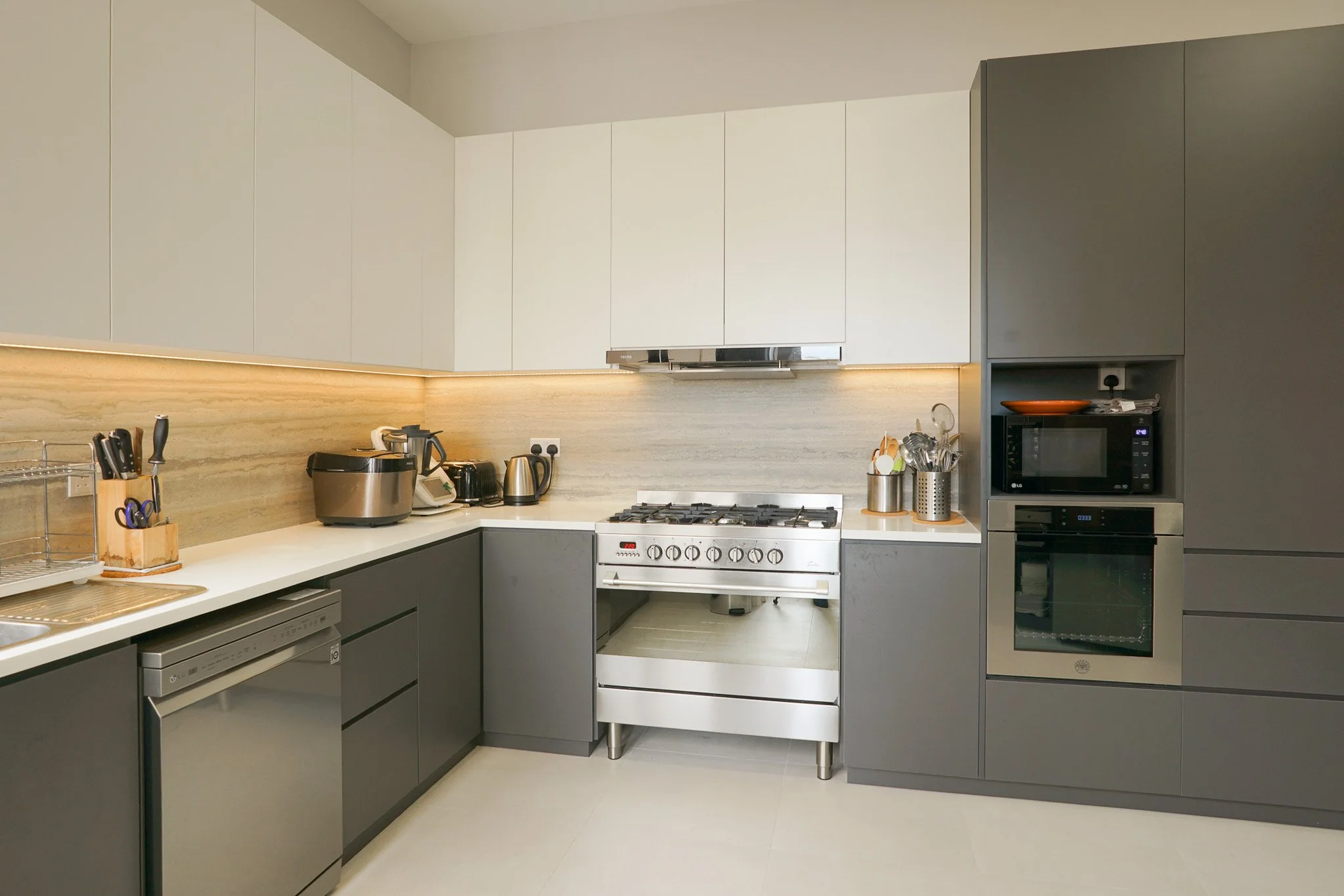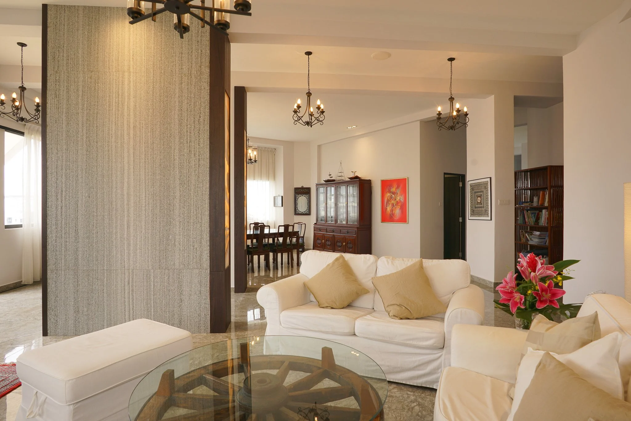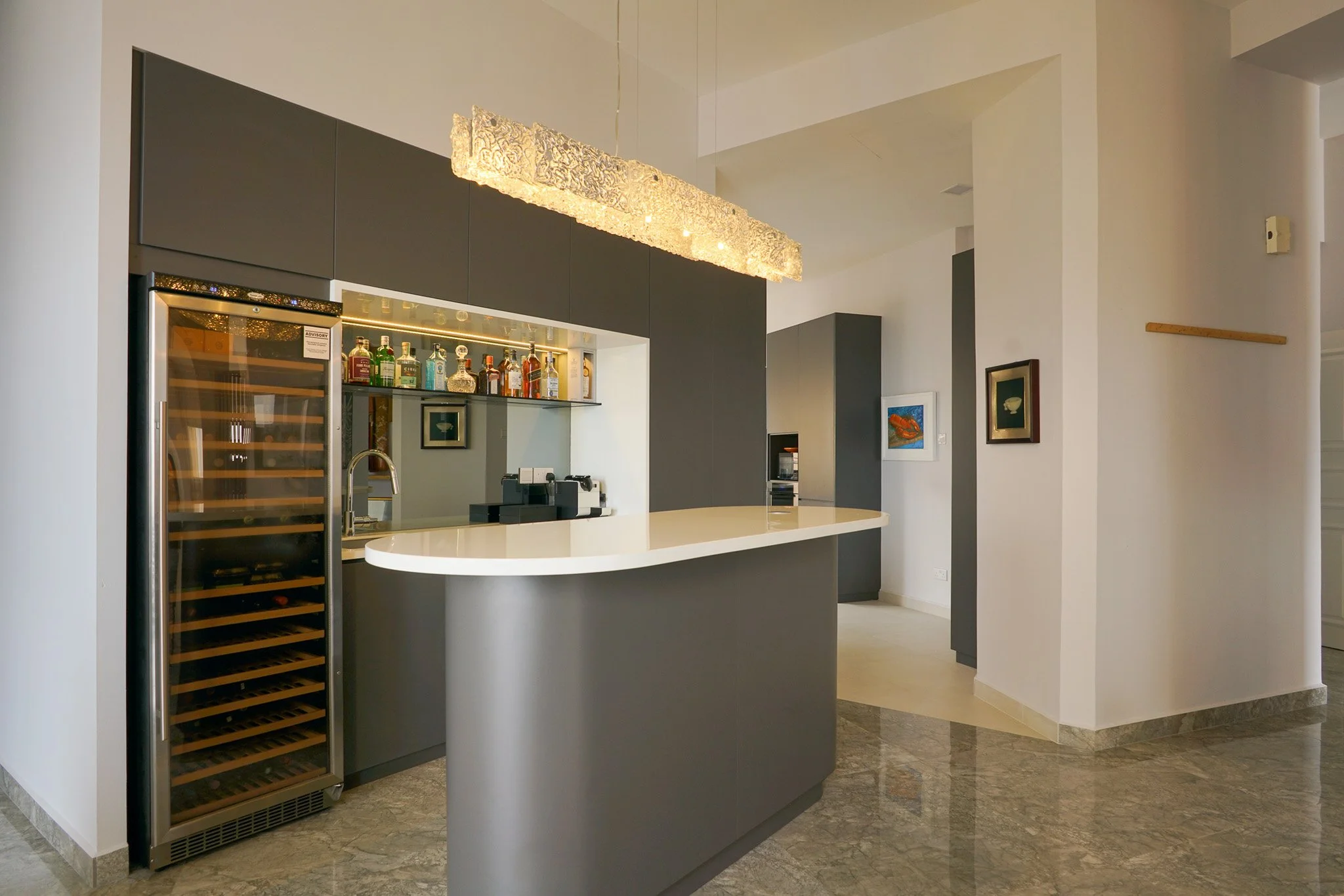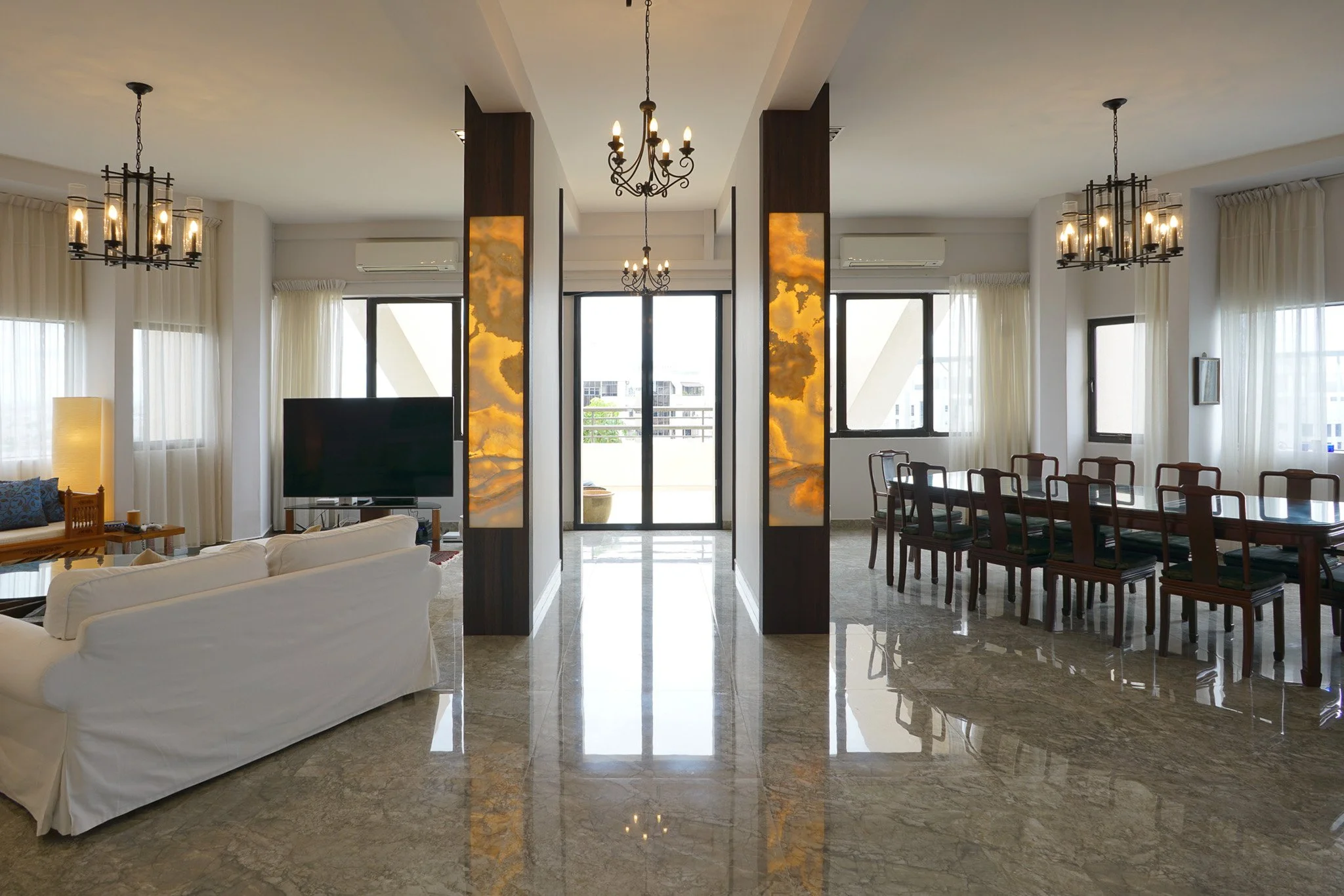 This condominium blends understated luxury with sculptural detail. The living space features two statement pillars with decorative accents that create a guided entry into the lounge and dining zones. A dark grey and white kitchen adds contrast and sophistication, complementing the home’s overall balanced and elegant feel.