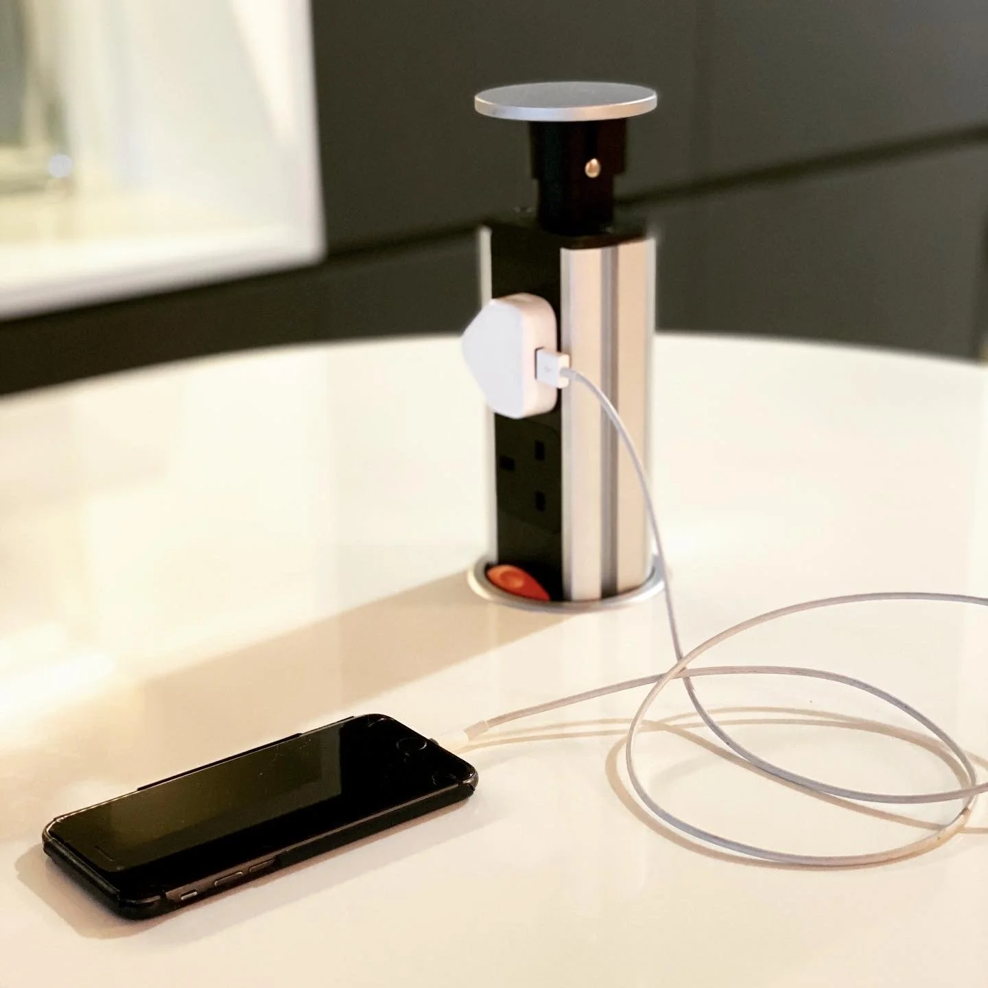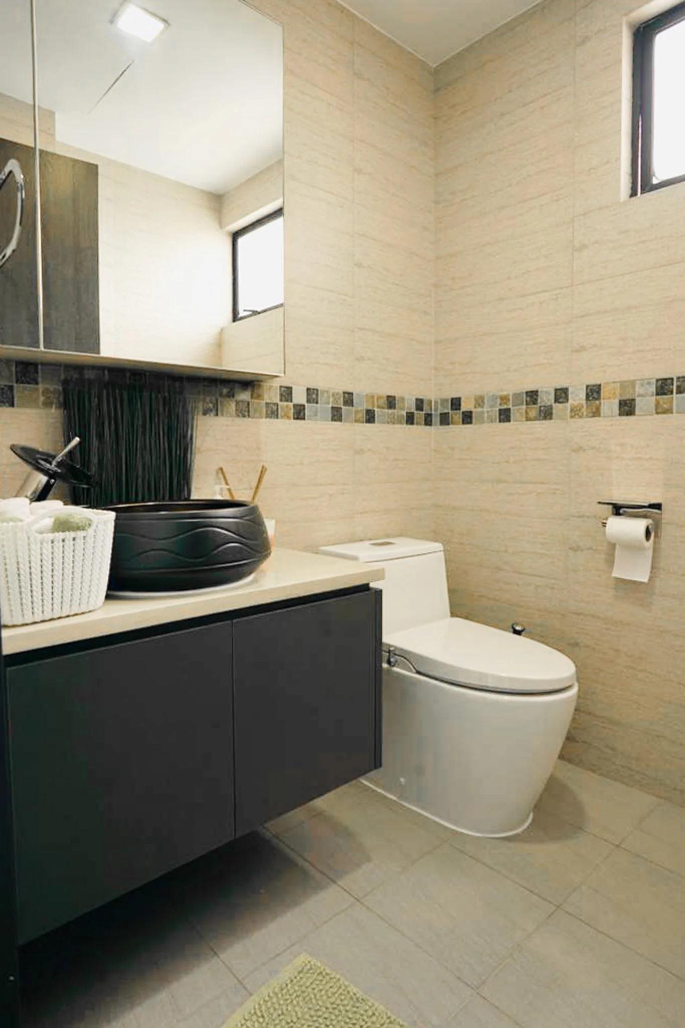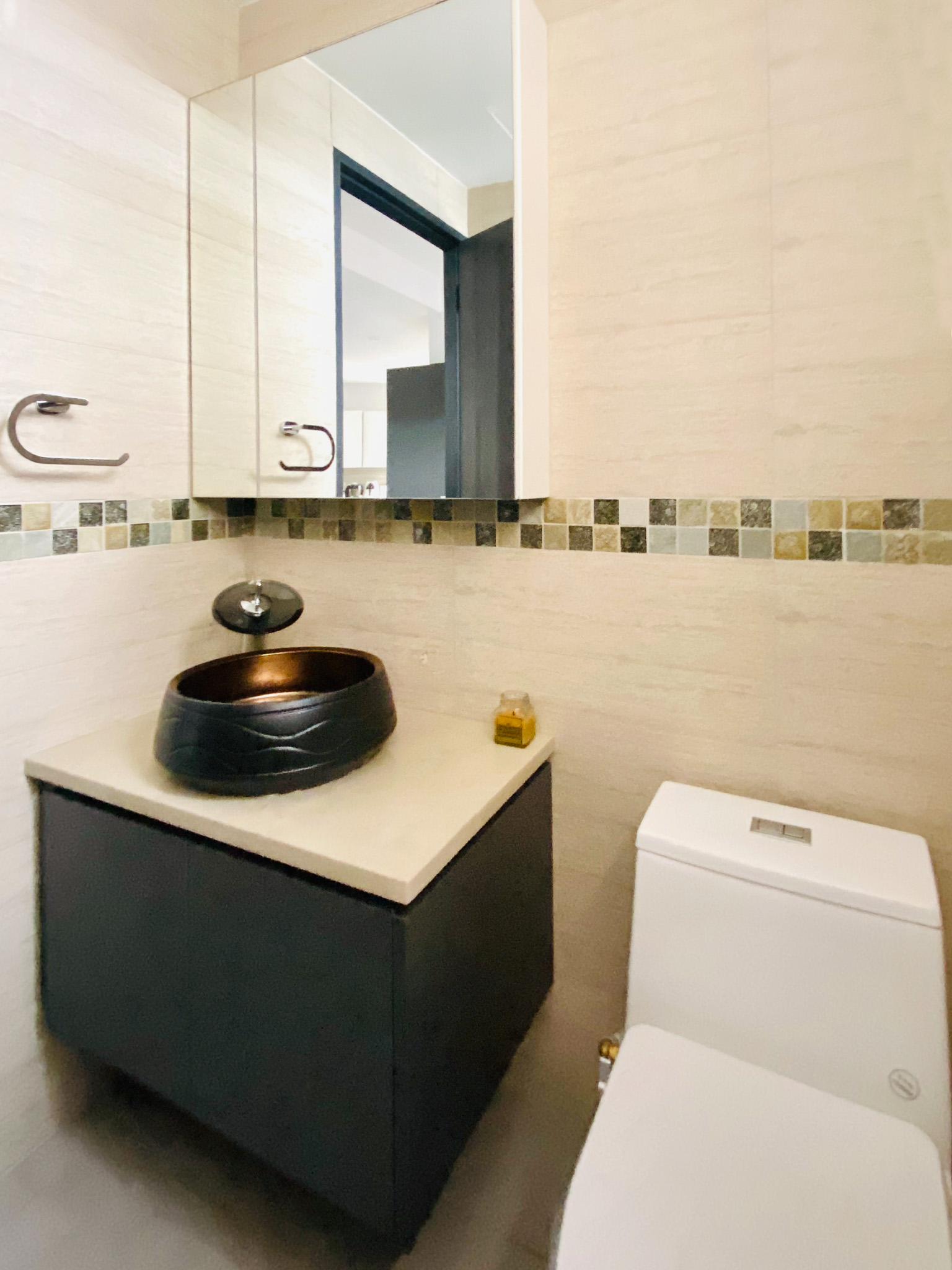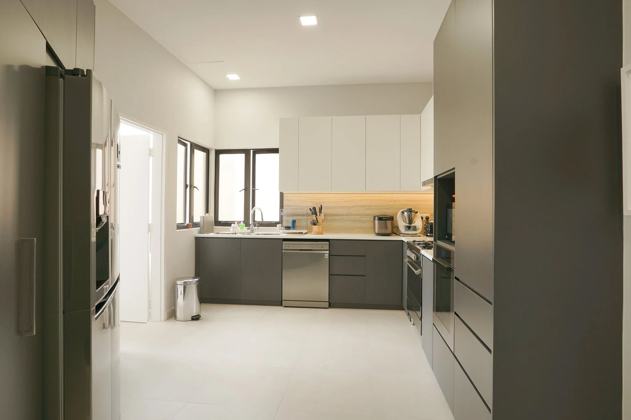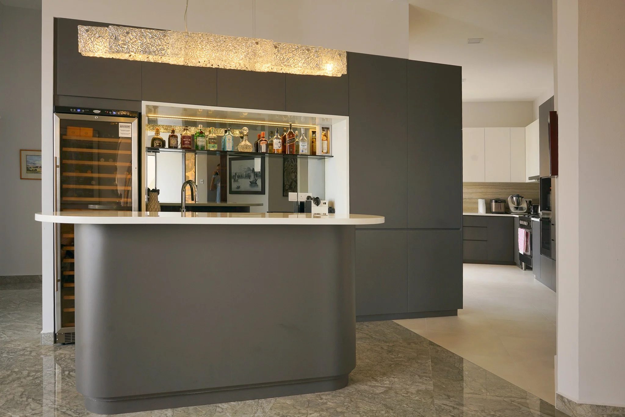 This condominium blends understated luxury with sculptural detail. The living space features two statement pillars with decorative accents that create a guided entry into the lounge and dining zones. A dark grey and white kitchen adds contrast and sophistication, complementing the home’s overall balanced and elegant feel.