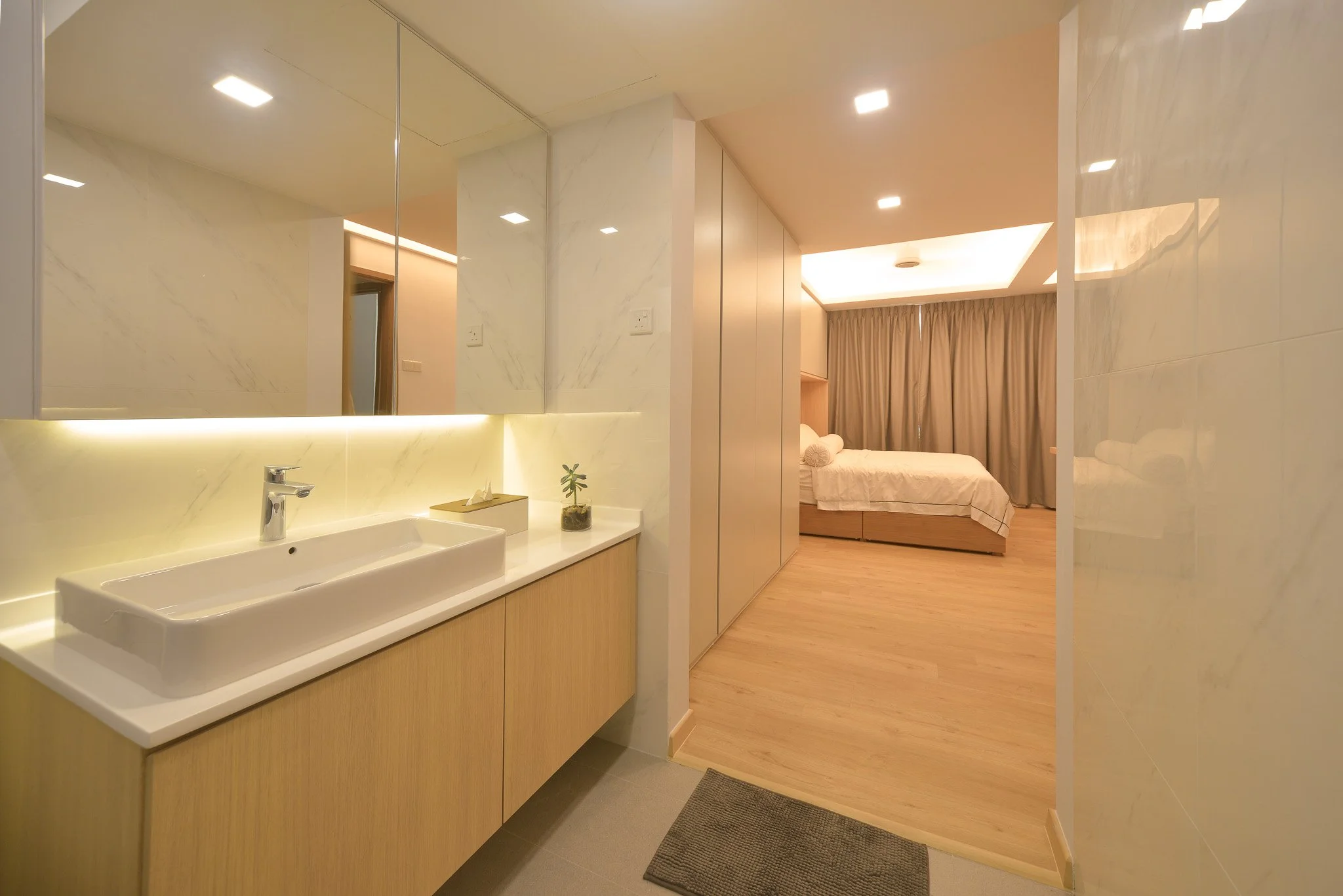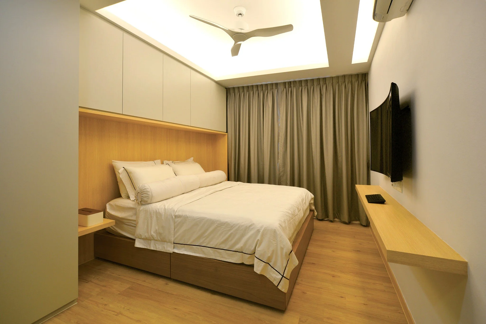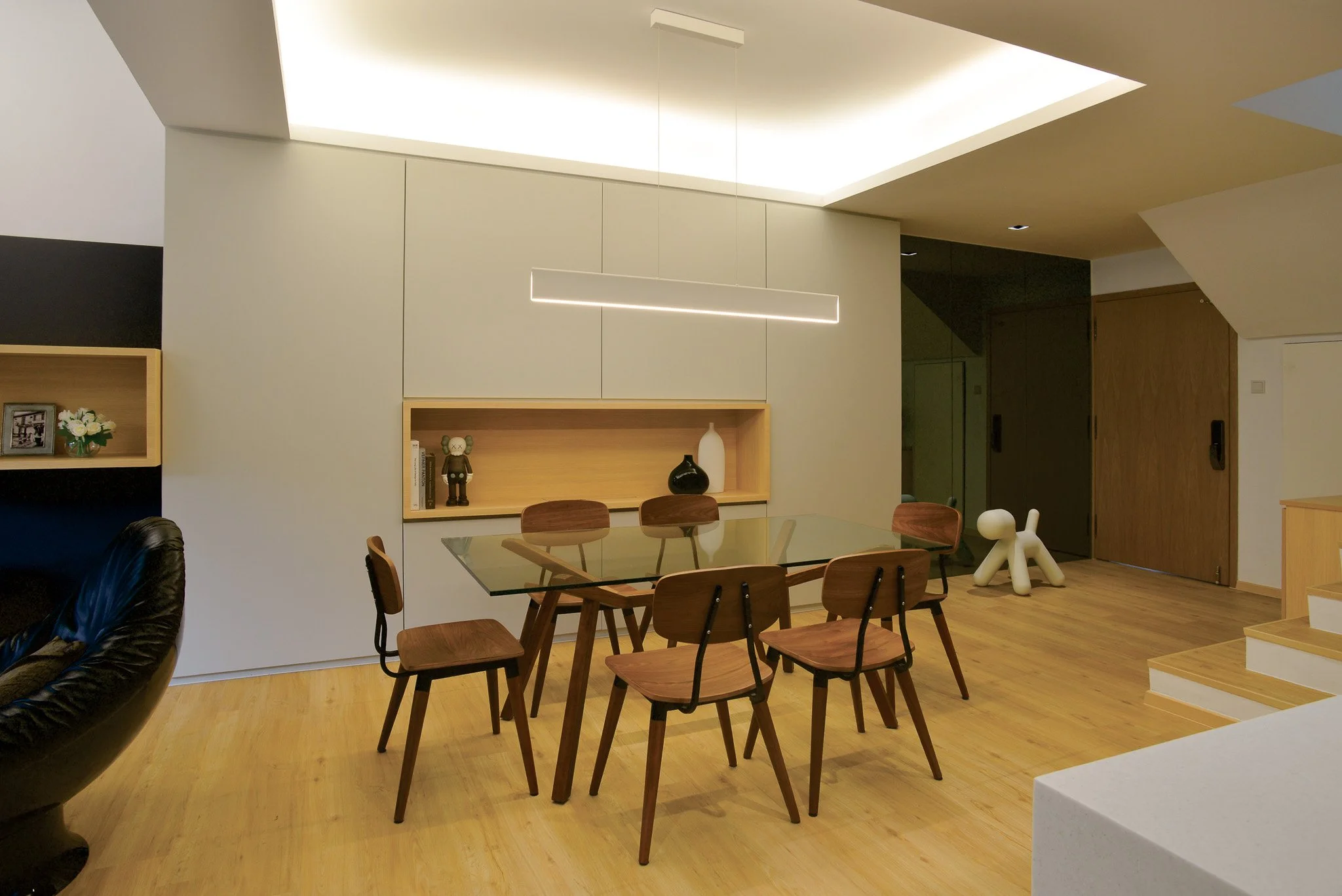 This condominium blends a clean white palette with warm wood tones to create a bright and modern living space. Key areas like the dining and kitchen zones balance bold and neutral finishes, layered materials, and functional storage. The living room contrasts light and dark elements with refined detailing, while custom cabinetry and integrated nooks in the bedrooms provide smart storage and a cozy, cohesive feel. Each space is designed to balance comfort, style, and everyday functionality.