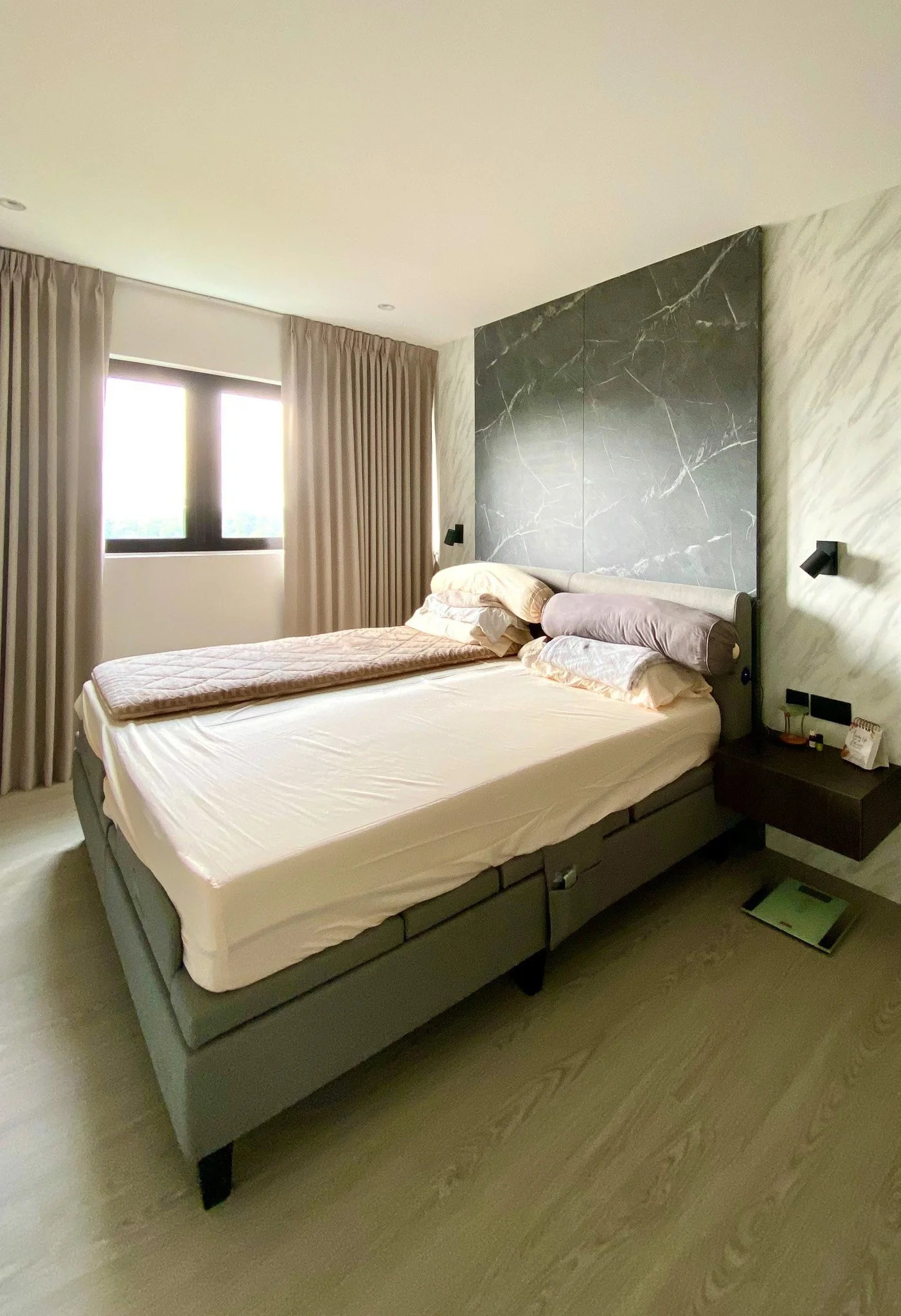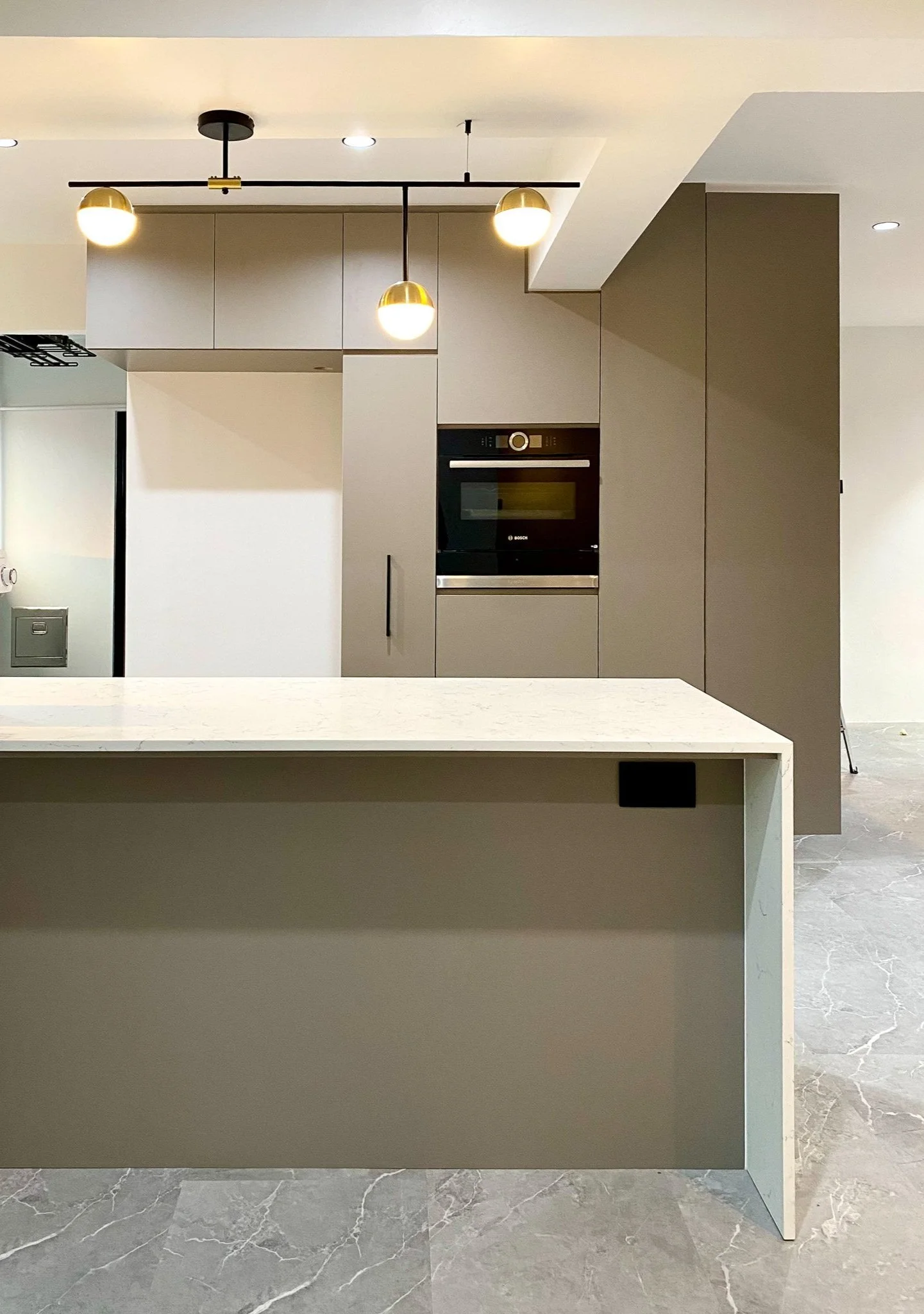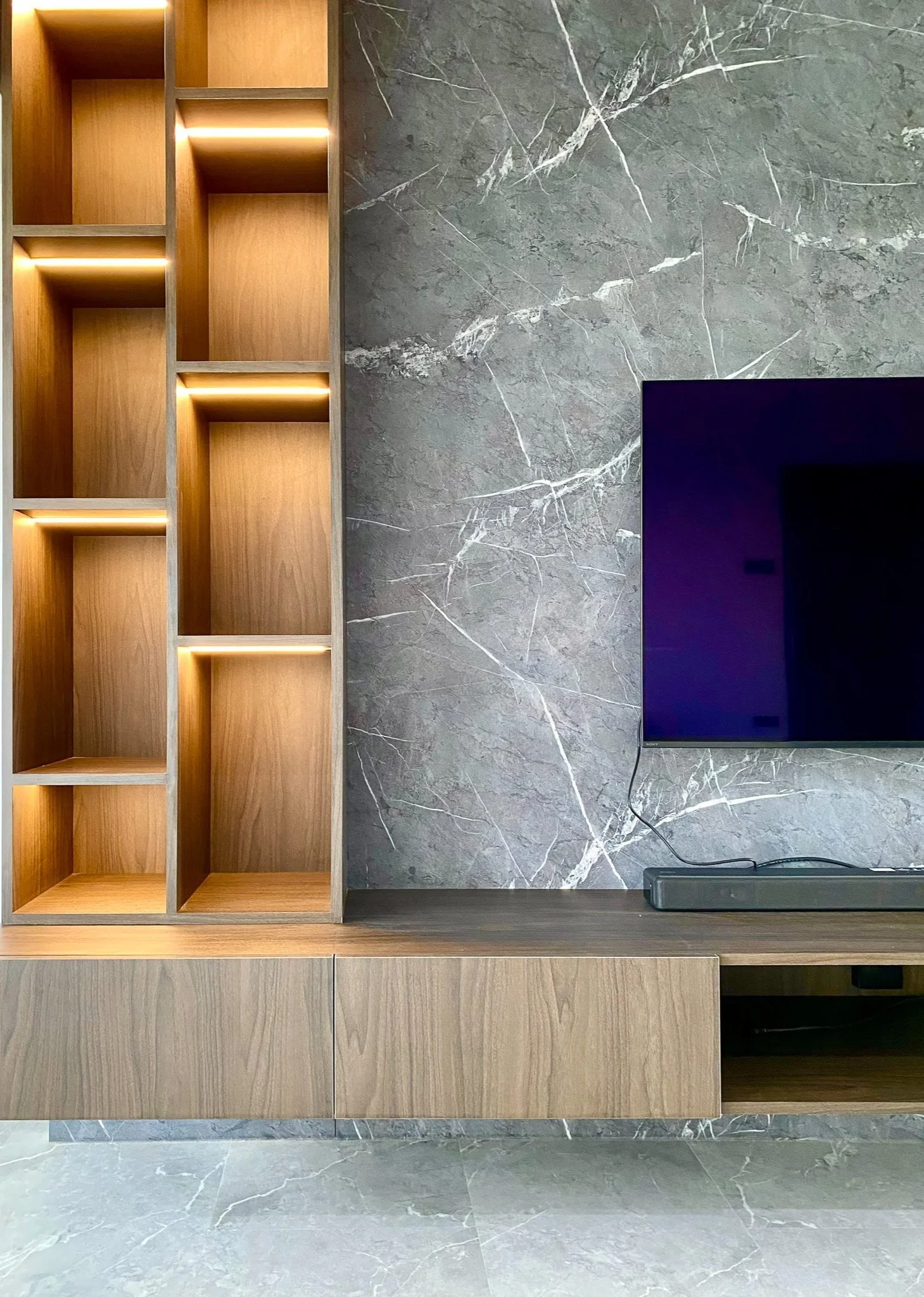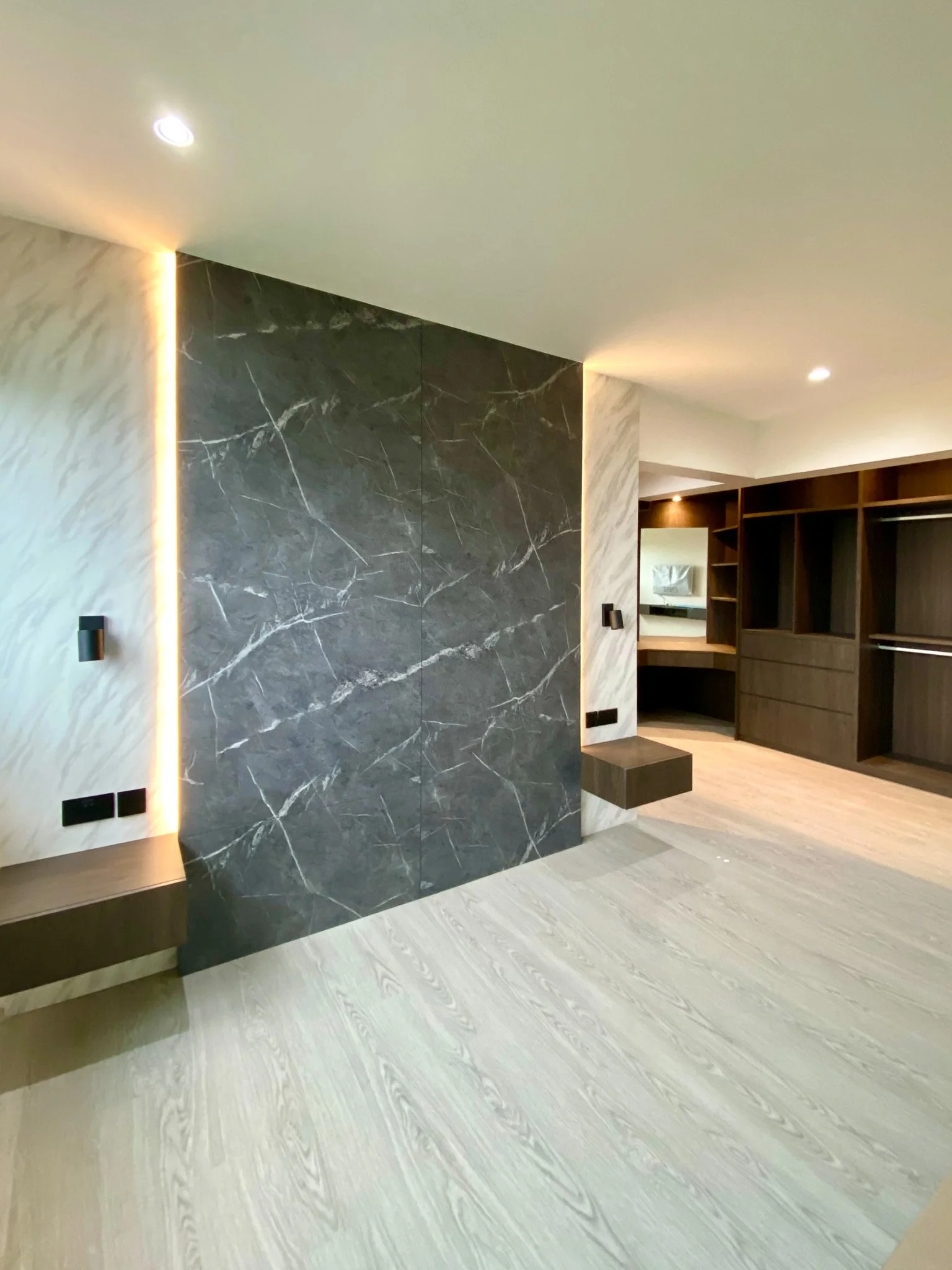 A home defined by contrast and quiet sophistication, its interior brings together dark marble, warm wood, and soft neutrals for a calm yet refined atmosphere. The living and kitchen areas are unified by clean lines and clever storage, while the master suite features layered materials, ambient lighting, and a seamless flow from bedroom to wardrobe to bathroom. Every space is designed to feel functional, elegant, and lived in.
