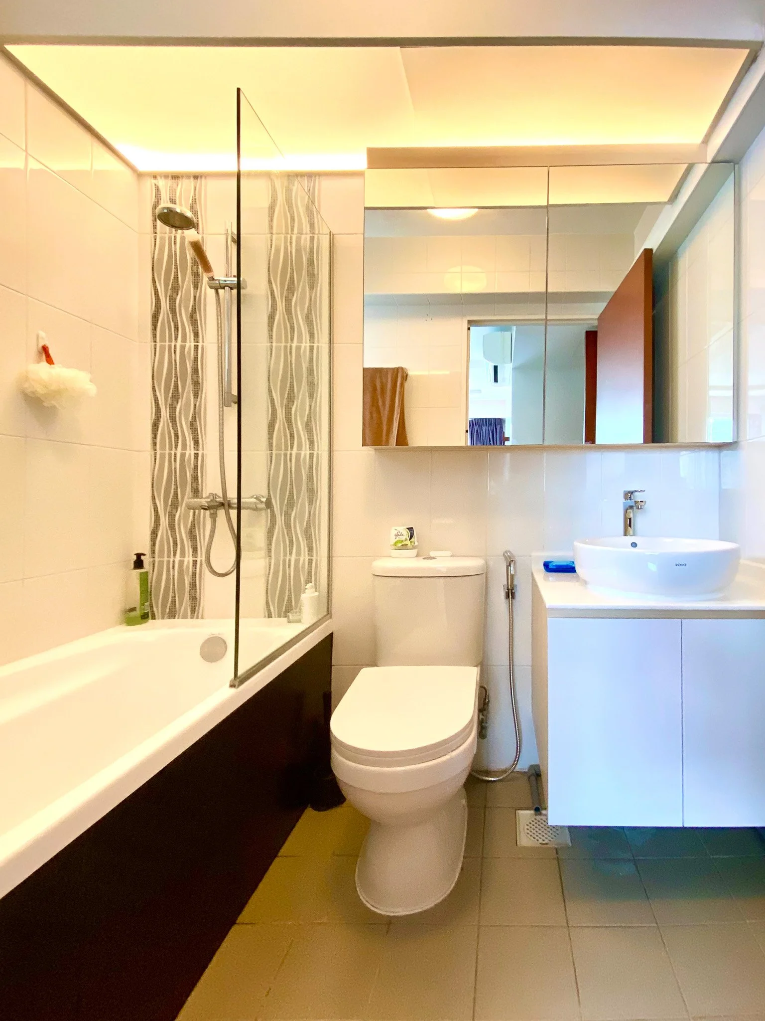 This bathroom was designed with simplicity, clarity, and ease of use in mind. A white palette keeps the space feeling clean and open, while a mirror cabinet provides practical storage without visual clutter. Warm ceiling lighting adds softness, creating a calm and refined atmosphere for everyday use.